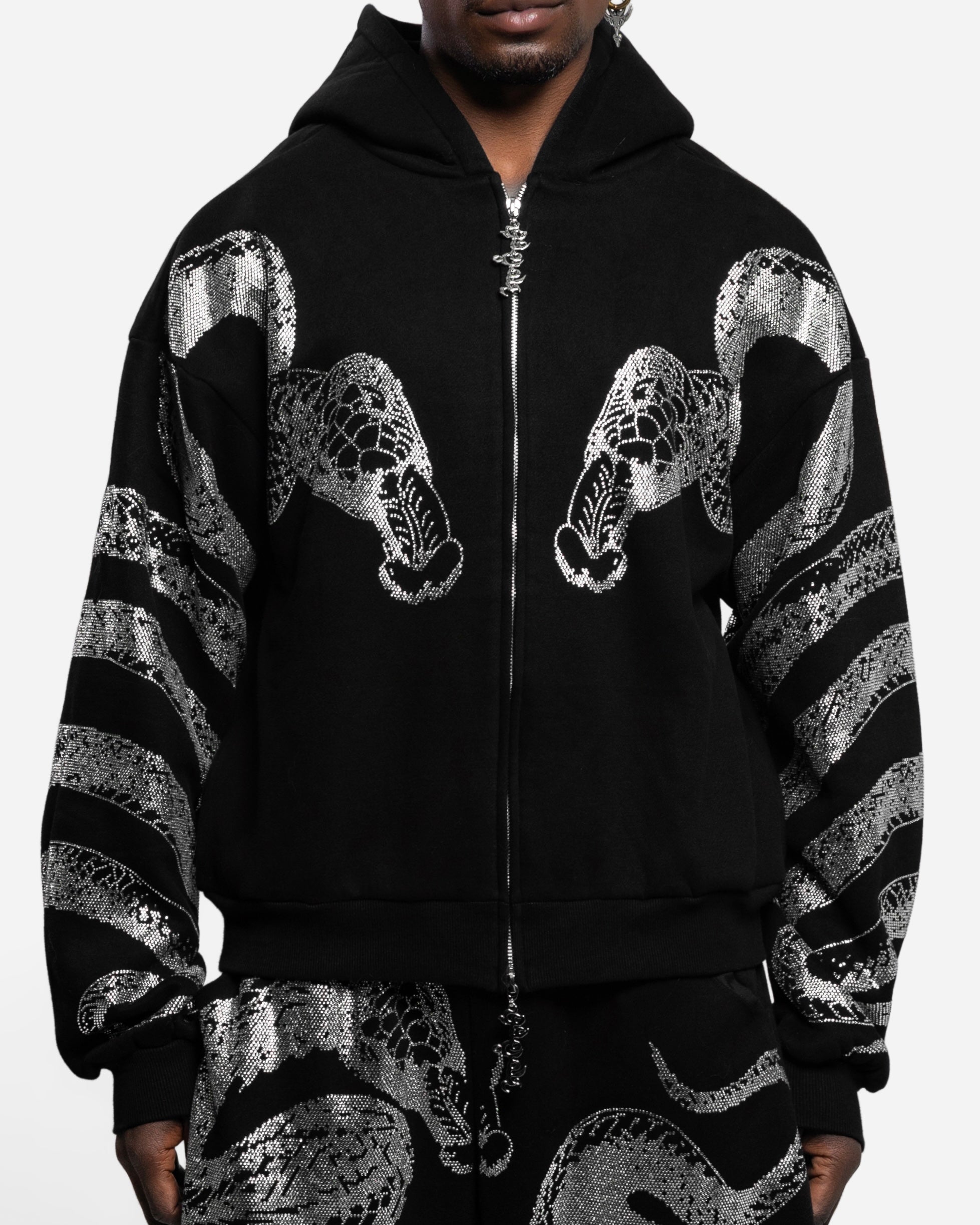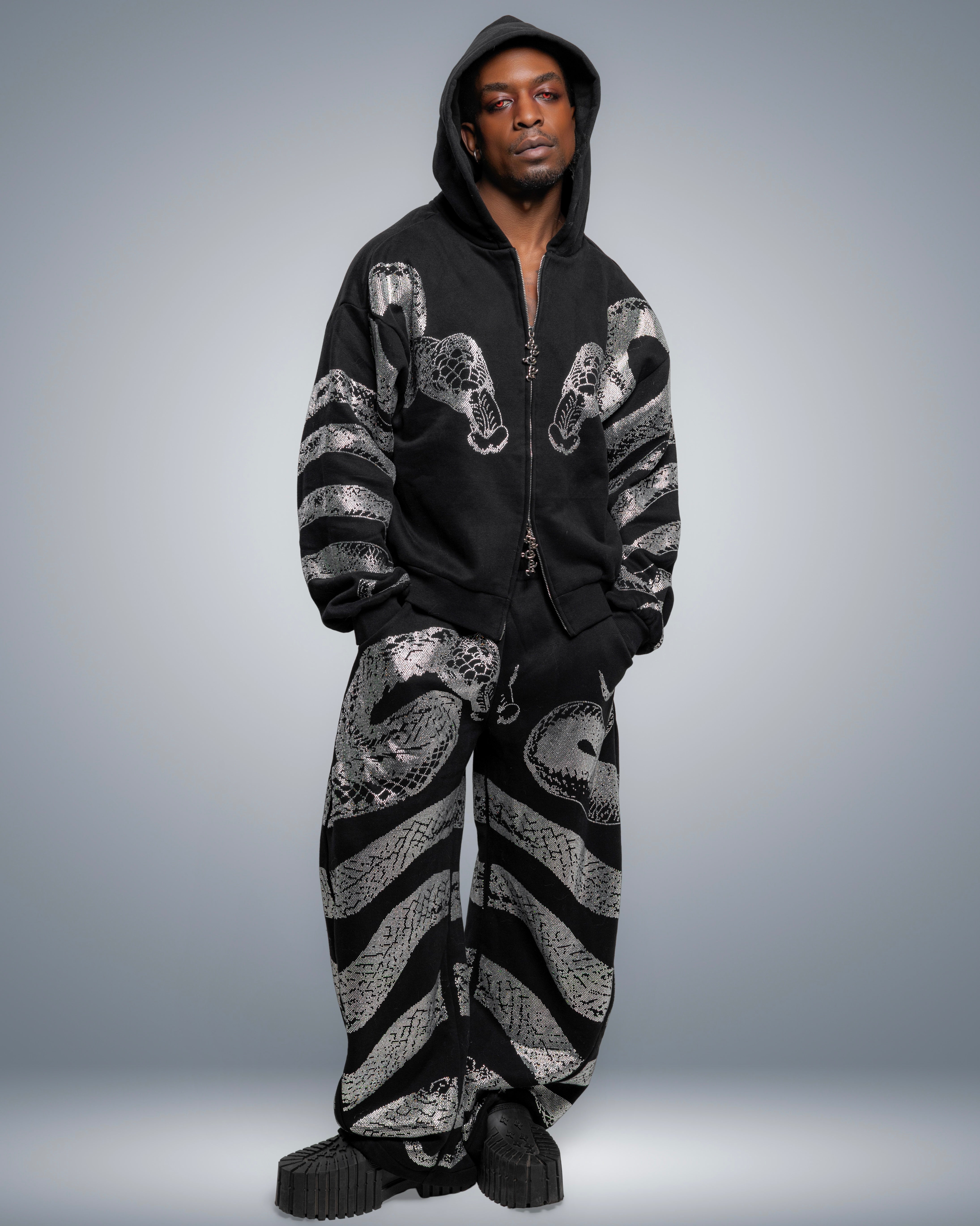 Snake-inspired rhinestone graphic Soft-touch fabric Oversized hoodie fit Wide-leg striped pants Unisex streetwear aesthetic Perfect for daily wear, concerts, nightlife, and statement styling