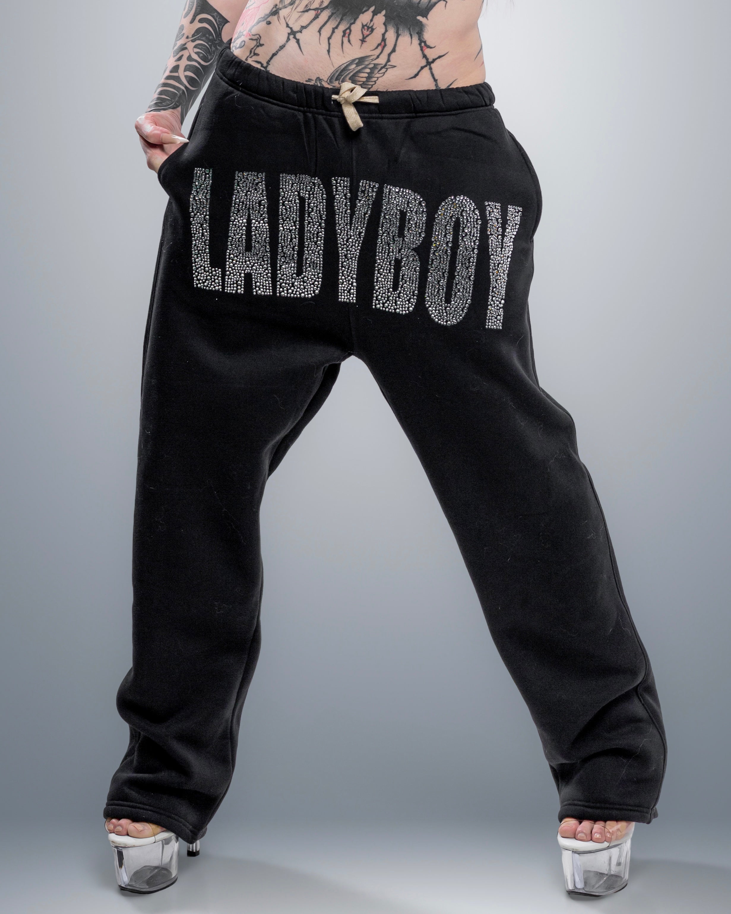 Soft, stretchy sweatpants featuring a bold statement rhinestone logo at the waistband.Designed with a relaxed straight-leg fit for everyday comfort.Adjustable drawstring waist for a secure and customizable fit.Perfect for casual styling, lounging, or streetwear looks.