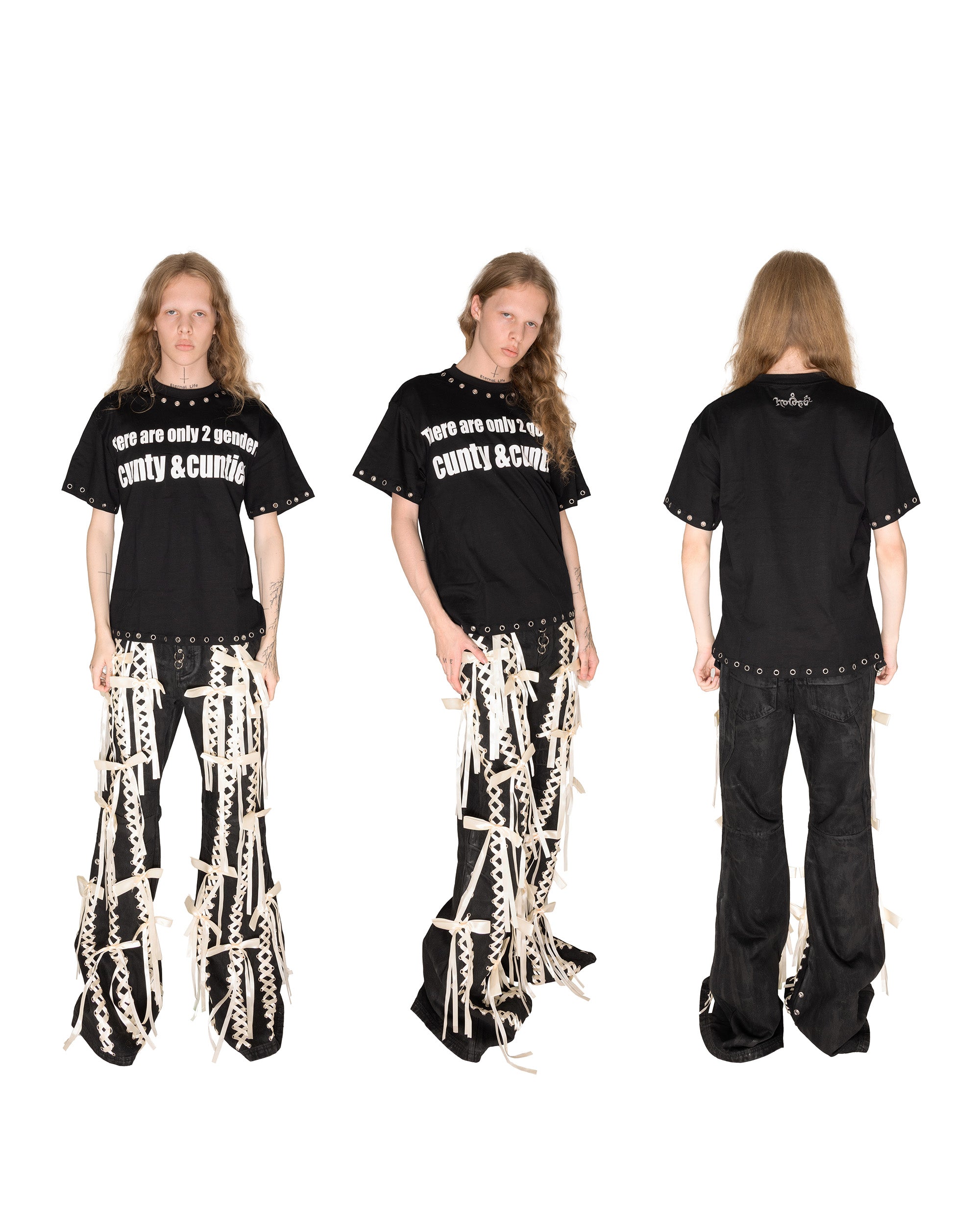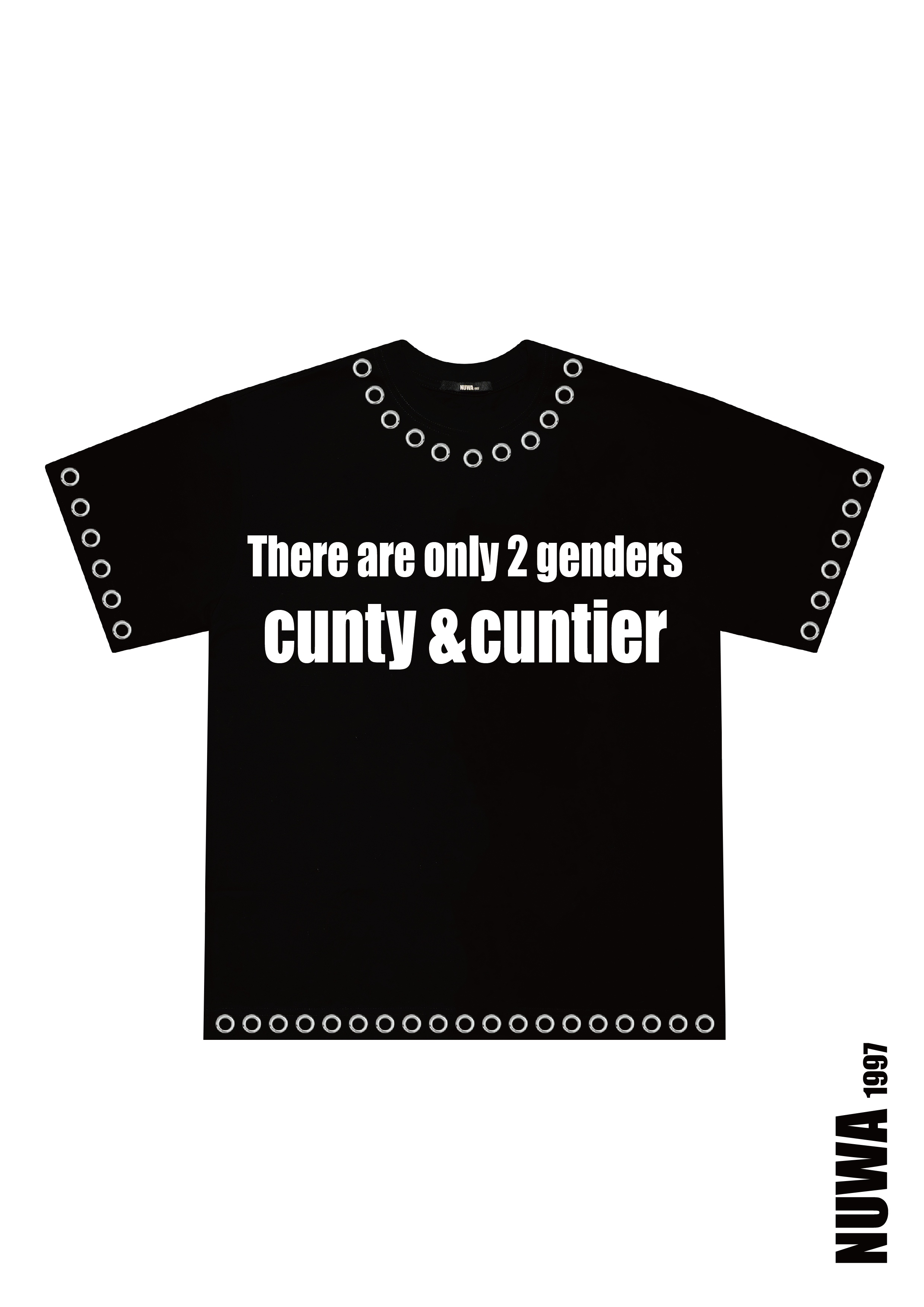 A bold, tongue-in-cheek graphic tee made from soft, heavyweight cotton. The front features the statement “There are only 2 genders: cunty & cuntier” in sharp white print—unapologetic, playful, and attitude-forward. Finished with metal eyelet detailing along the hem and sleeves, adding a punk-industrial touch. Relaxed fit and easy to style on its own or layered for an elevated streetwear look.