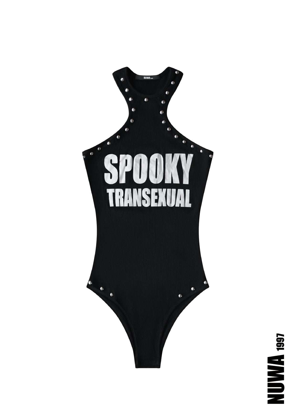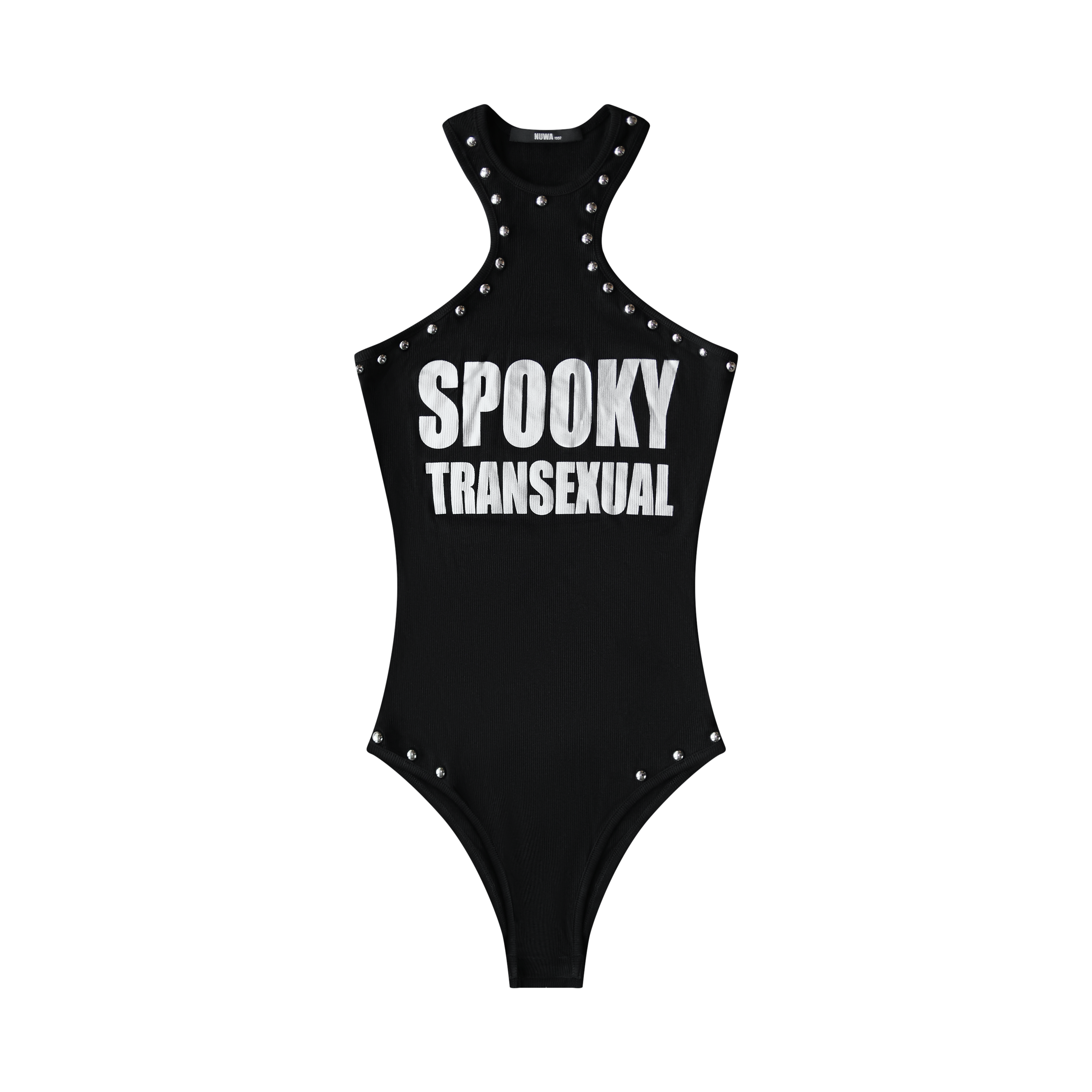 Body-contouring fit Metal stud (rivet) detailing Bold “SPOOKY TRANSSEXUAL” lettering Stretchy, comfortable fabric Snap closure at the bottom